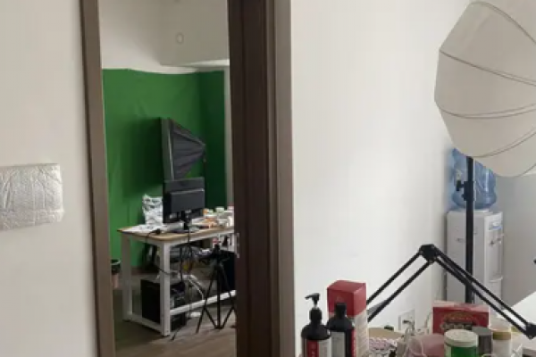 面积66.33平方,一套一,客厅有办公位;一个打包台直播搭建,一个仓库直播搭建,卧室有个绿幕直播间搭建;三个直播场地完美闭环。